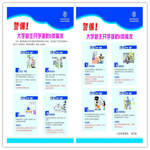 针对当前社会治安形势,特别是针对大学生新生的电信诈骗案件高发,学校保卫处精心组织编印了《警惕!大学新生开学谨防8类骗术》的宣传单。8月31日,协调学生处、招生办,在每个新生报到的必经关口——录取资格审核处向每新生发放,确保新生人手一份,提醒新生保持警惕,避免上当受骗。同时,我们与后勤宿管科紧密配合,利用宿舍内的广播滚动播出安全提醒和注意事项,起到了一定的震慑和防范作用。根据北京市教工委的工作要求,保卫处克服时间紧,人员少、工作量大等困难,在新生军训出发前,向全体2016级新生(研究生+本科生)近1600人发放了《大学生安全知识手册》和《拒绝邪教》二本学生安全教育手册,方便同学及时掌握安全防范知识。
